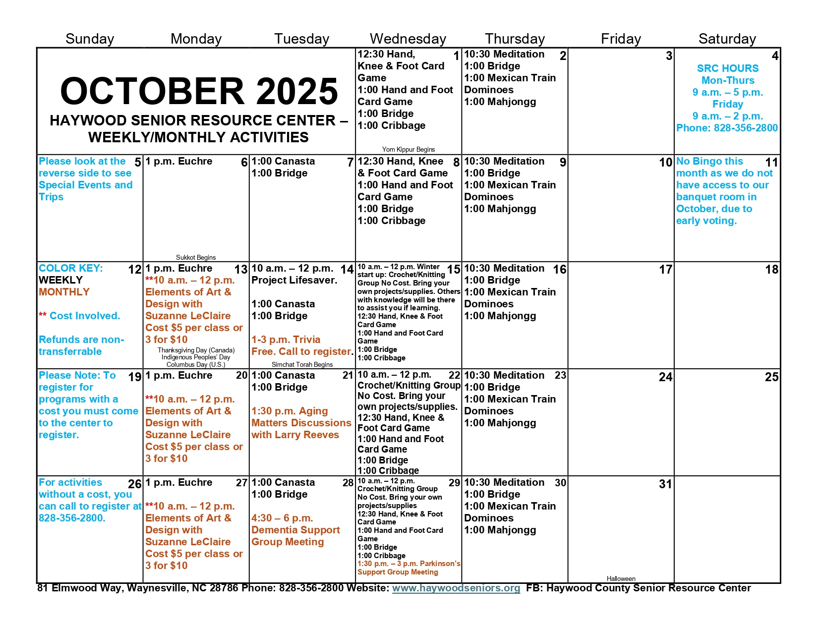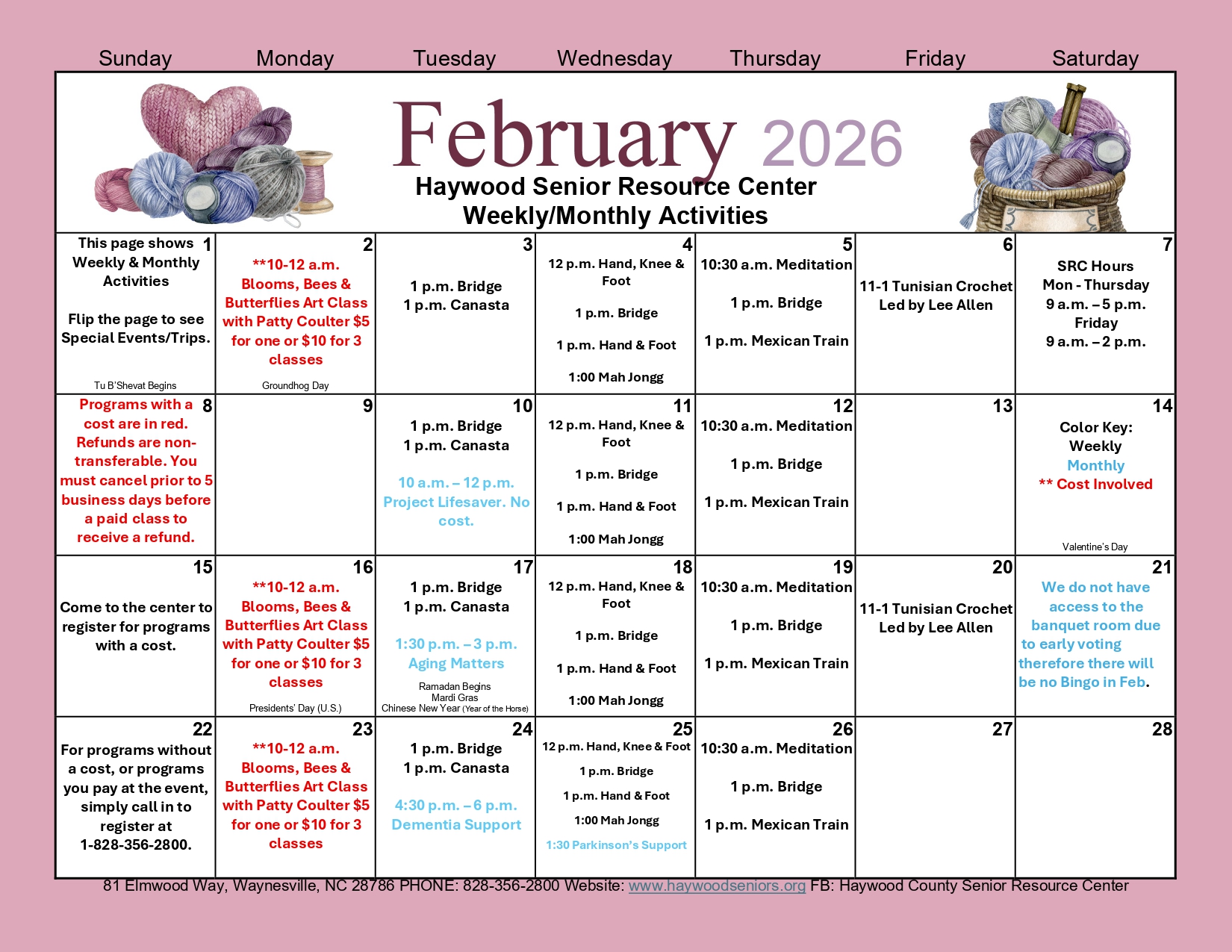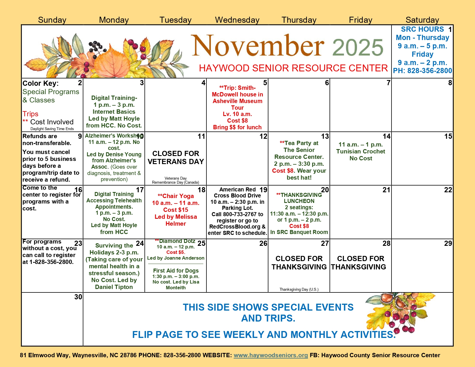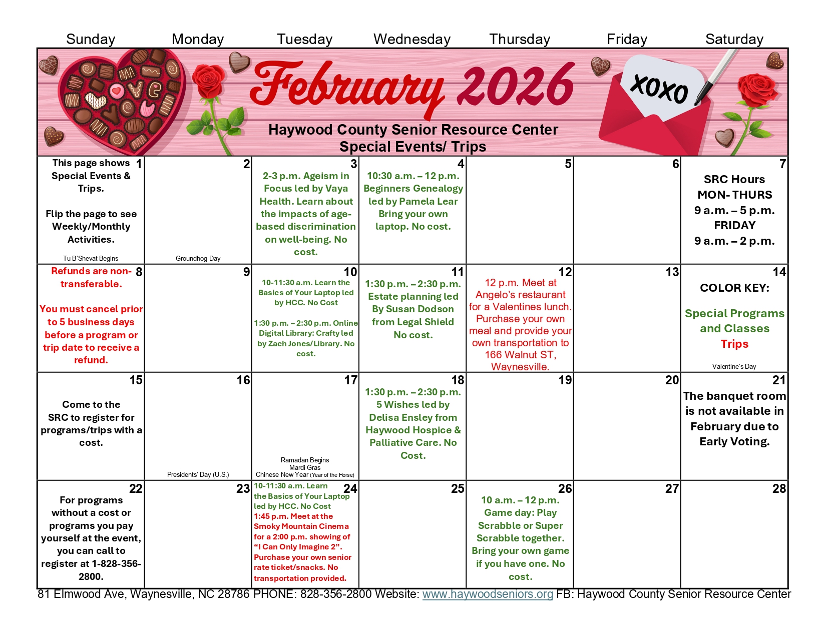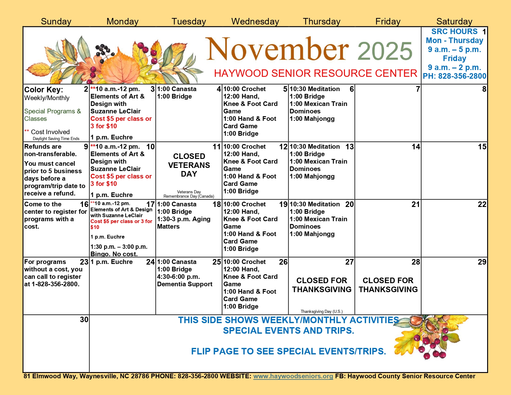 *Must come into the SRC to register for programs or trips with a cost. CASH OR CHECK ONLY